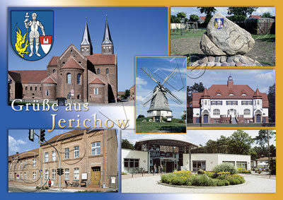Ansichtskarte "Grüße aus Jerichow" , Weltkartenformat (148 mm x 105 mm), UV-Lack hochglanz, Motivkarte mit 6 Teilbildern