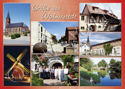 Ansichtskarte "Grüße aus Wolmirstedt" , Weltkartenformat (148 mm x 105 mm), UV-Lack hochglanz, Motivkarte mit 7 Teilbildern