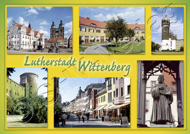 Ansichtskarte "Lutherstadt Wittenberg" , Weltkartenformat (148 mm x 105 mm), UV-Lack hochglanz, Motivkarte mit 6 Teilbildern