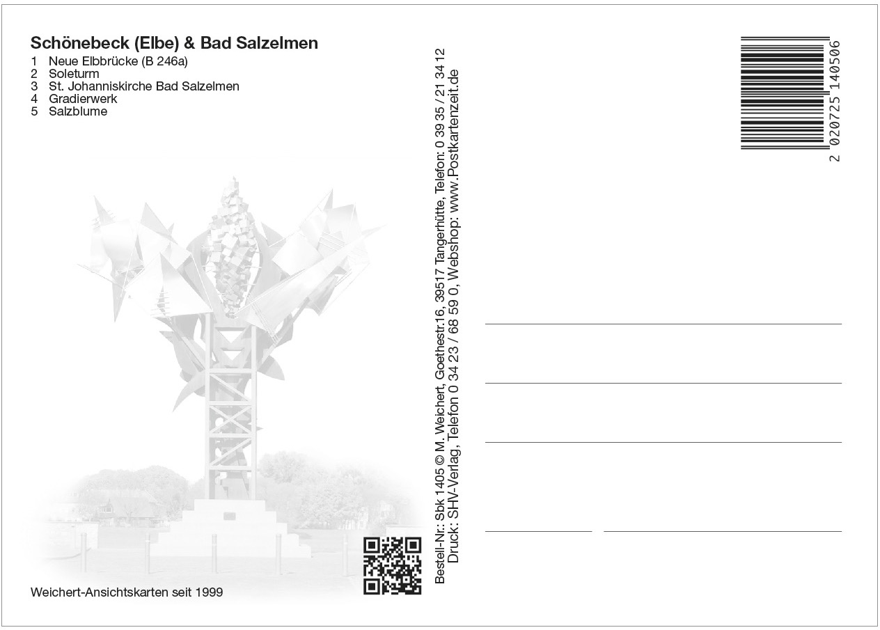 Ansichtskarte "Schönebeck (Elbe) und Bad Salzelmen" , Weltkartenformat (148 mm x 105 mm), UV-Lack hochglanz, Motivkarte mit 5 Teilbildern